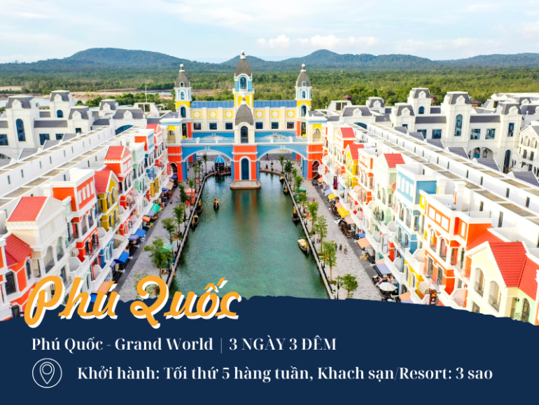 Khởi hành tham quan Grand World Phú Quốc – Đây là một tổ hợp vui chơi, giải trí và mua sắm cực kỳ đẳng cấp thuộc Phú Quốc United Center, có vị trí tọa lạc ngay tại bãi Dài, xã Gành Dầu, Phú Quốc, Kiên Giang – nơi đây được tập đoàn Vingroup xây dựng và hoàn thành dự án vào cuối năm 2020 vừa qua. Grand World Phú Quốc được xây dựng gồm 23 khu khác nhau. Tại mỗi khu lại sở hữu một chức năng riêng để phục vụ cho các nhu cầu đa dạng của khách du lịch (tự túc các vé vui chơi).